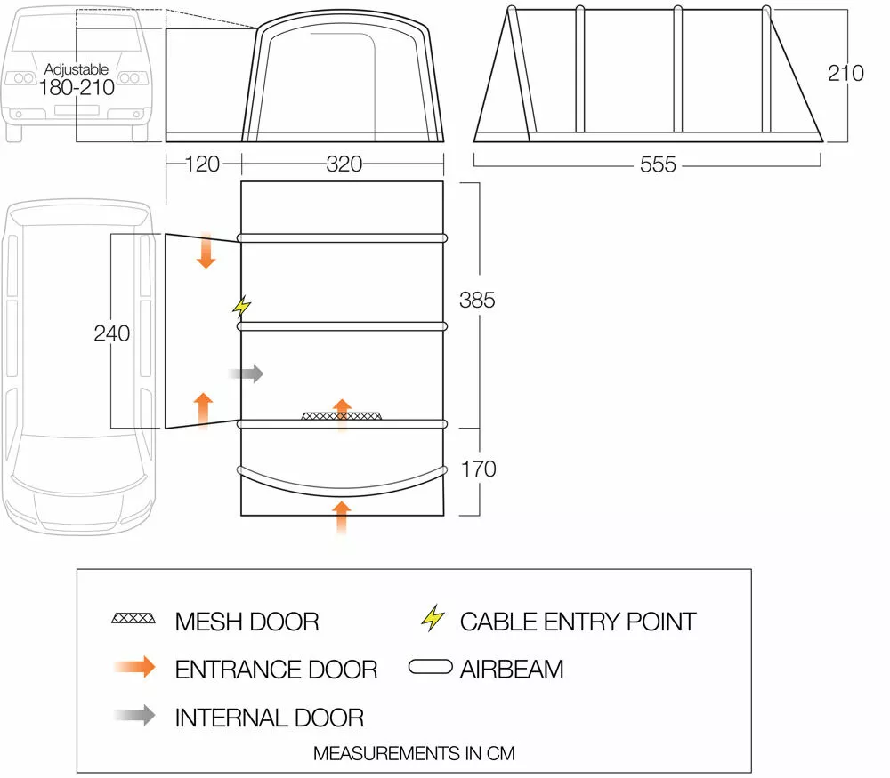 The Airbeam design is embedded into the product, which makes it quick to set up and set down, perfect for shorter-term camping trips, and touring campers moving from campsite to campsite. Further to this, it has the ability to add optional extras, such as a 2-person inner tent (BR001) or the Galli 4-person inner tent, to create sleeping quarters to the rear.