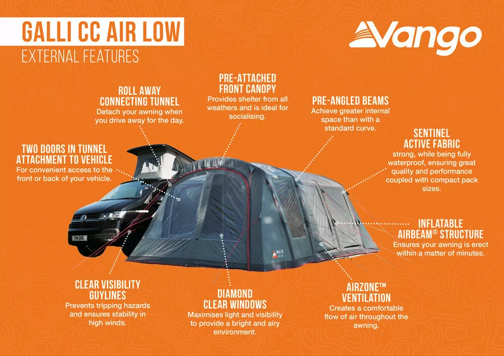 The Vango Galli CC is a new addition to the Vango Sentinel Active drive-away collection, designed to offer a lightweight, introductory awning with a 70 Denier Polyester fabric. The CC stands for Closed Canopy, as, unlike its predecessors, the Galli CC allows the front to be fully enclosed from the elements. The purpose of the lightweight fabric is to offer the lightest, smallest pack size available, with a large living space and standing height throughout. It is highly versatile, with a parallel fitting design, to allow the awning to sit alongside the camper van, to maximise the space on the campsite pitch. However, with the connecting panel being to the left, this makes the awning more suitable for vans with their habitation door on the UK passenger side of the van.